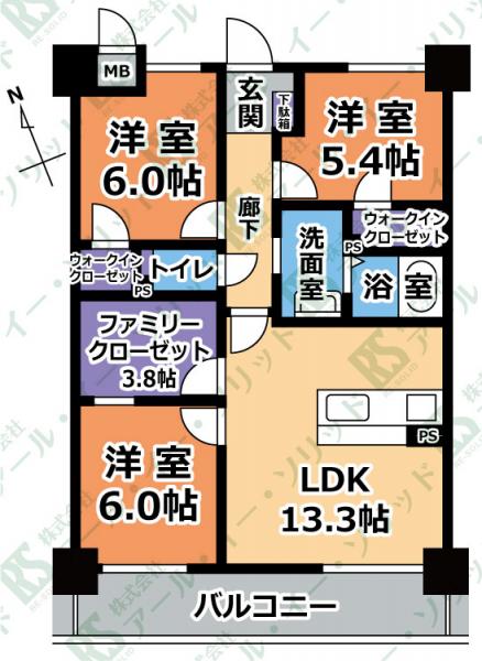 | 間取り詳細 | (LDK13.3・洋6.0・洋6.0・洋5.4・S3.8) |
